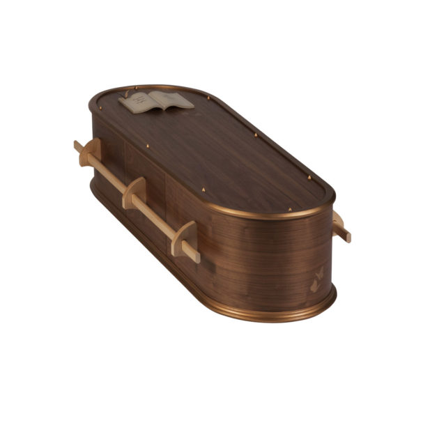 This coffin is made from black American walnut, a beautiful deep brown colour with a soft sheen water-based lacquer, providing a feeling of comfort and calm.