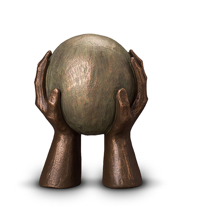 - This ceramic bronze designer urn depicts the ‘world in hands’ imagery – the perfect way to remember your loved one.